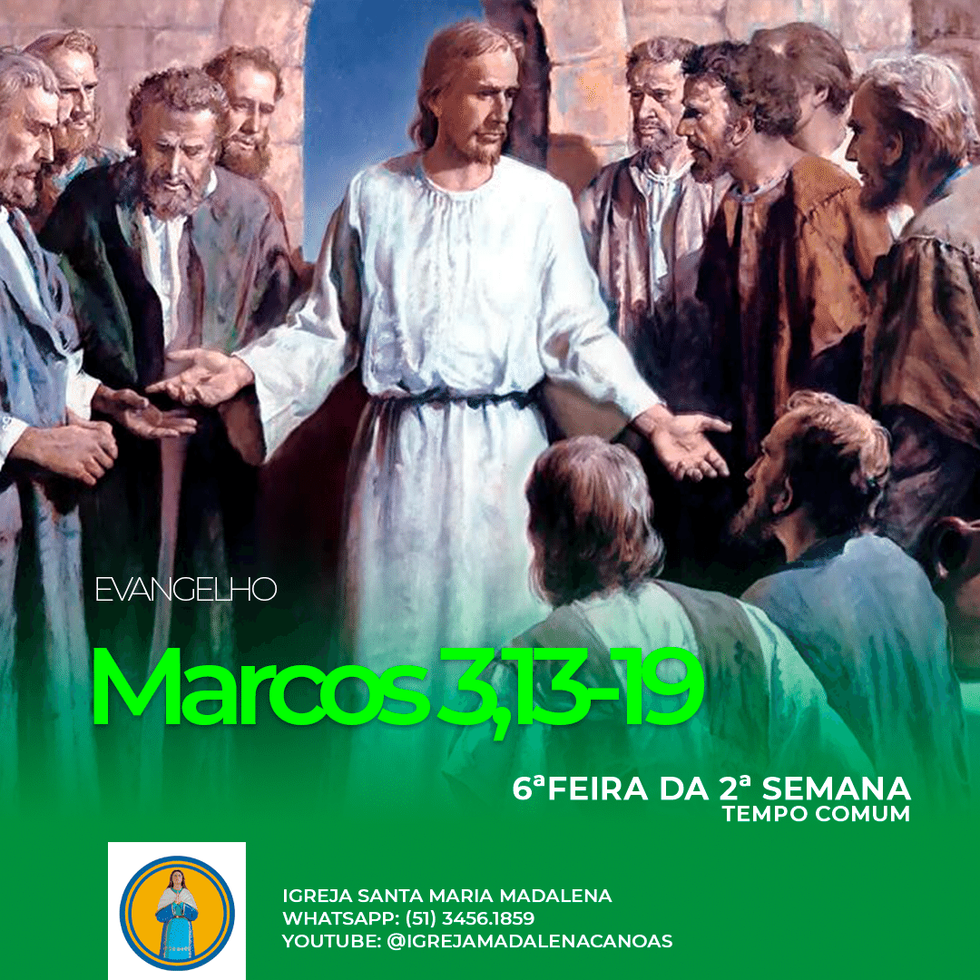 + Proclamação do Evangelho de Jesus Cristo segundo São Marcos Naquele tempo: Jesus subiu ao monte e chamou os que ele quis. E foram até ele. Então Jesus designou Doze, para que ficassem com ele e para enviá-los a pregar, com autoridade para expulsar os demônios. Designou, pois, os Doze: Simão, a quem deu o nome de Pedro; Tiago e João, filhos de Zebedeu, aos quais deu o nome de Boanerges, que quer dizer 'filhos do trovão'; André, Filipe, Bartolomeu, Mateus, Tomé, Tiago, filho de Alfeu, Tadeu, Simão, o cananeu, e Judas Iscariotes, aquele que depois o traiu. Palavra da Salvação.