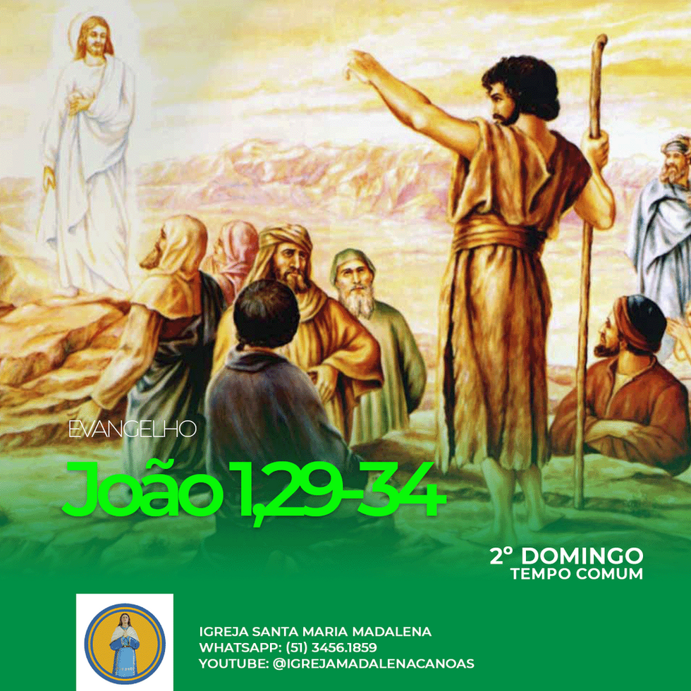 Naquele tempo, João viu Jesus aproximar-se dele e disse: "Eis o Cordeiro de Deus, que tira o pecado do mundo. Dele é que eu disse: 'Depois de mim vem um homem que passou à minha frente, porque existia antes de mim'. Também eu não o conhecia, mas se eu vim batizar com água, foi para que ele fosse manifestado a Israel". E João deu testemunho, dizendo: "Eu vi o Espírito descer, como uma pomba do céu, e permanecer sobre ele. Também eu não o conhecia, mas aquele que me enviou a batizar com água me disse: 'Aquele sobre quem vires o Espírito descer e permanecer, este é quem batiza com o Espírito Santo'. Eu vi e dou testemunho: Este é o Filho de Deus!" Palavra da Salvação.