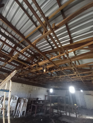 A primeira ação realizada foi a retirada do forro do salão. O forro estava bastante estragado e solto em diversas partes. Meses após a enchente havia água dentro do forro, que é de PVC, e alguns objetos entre o forro e o telhado, dentre eles alimentos.